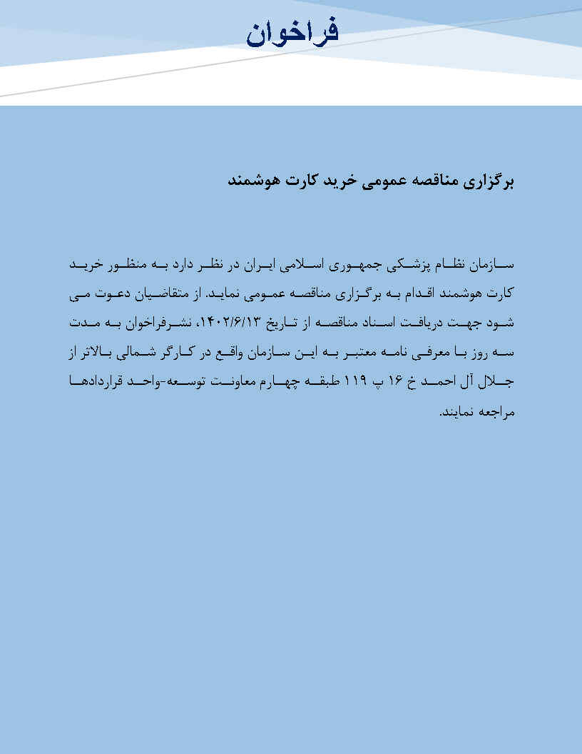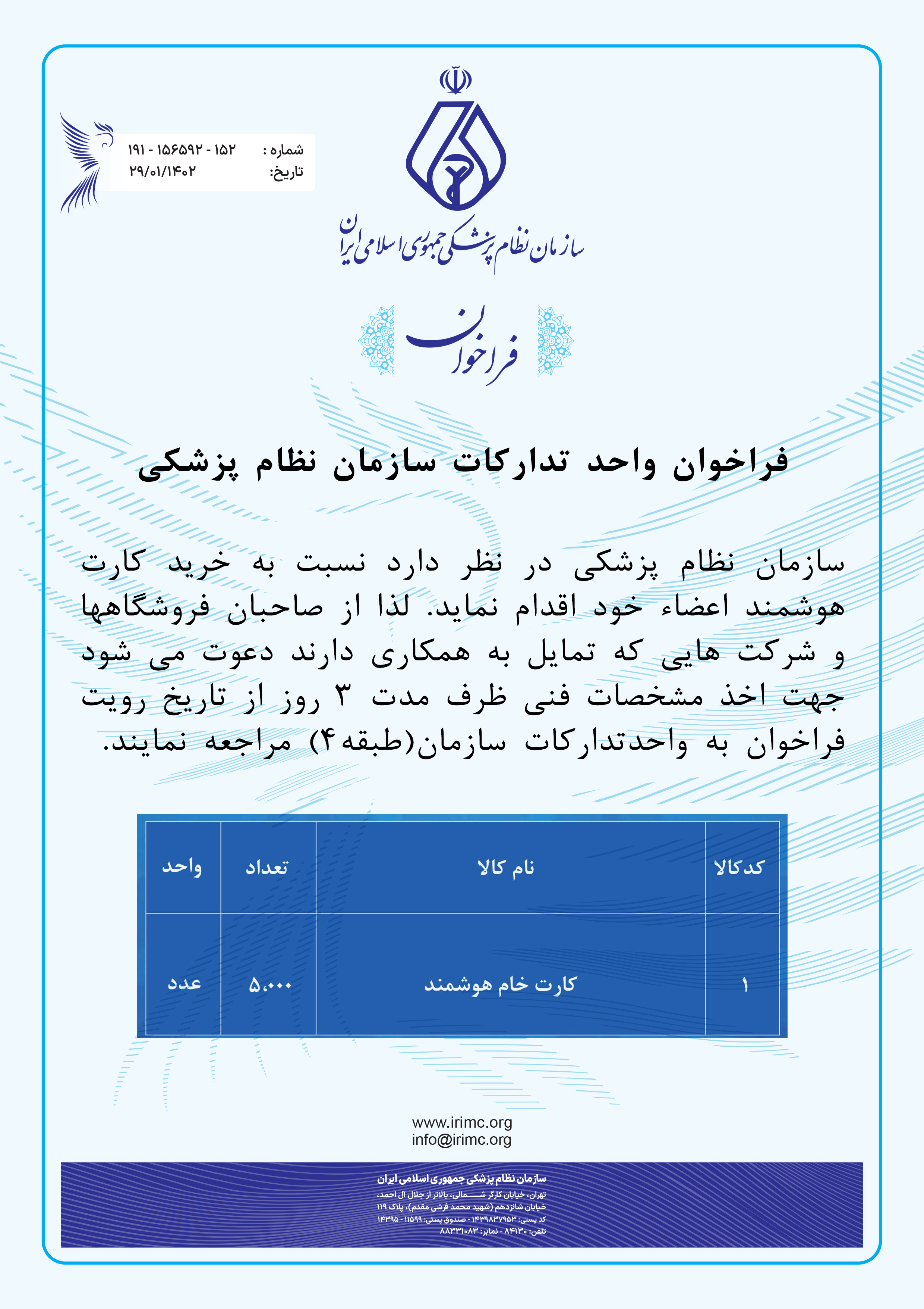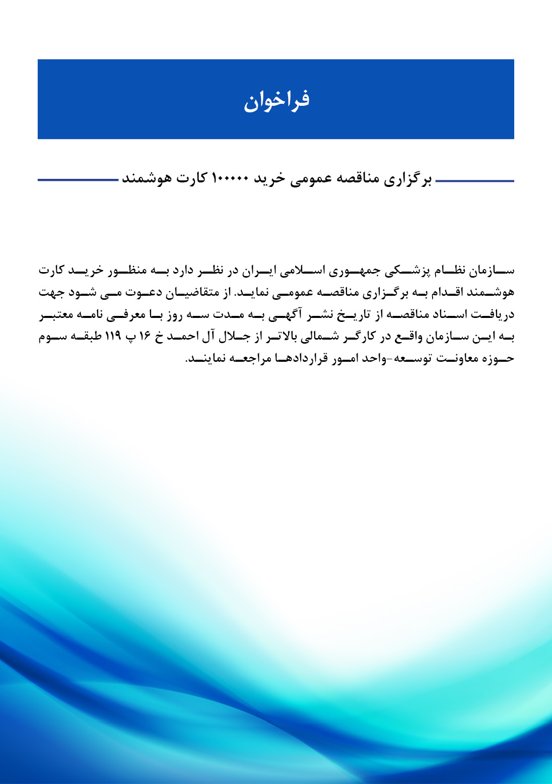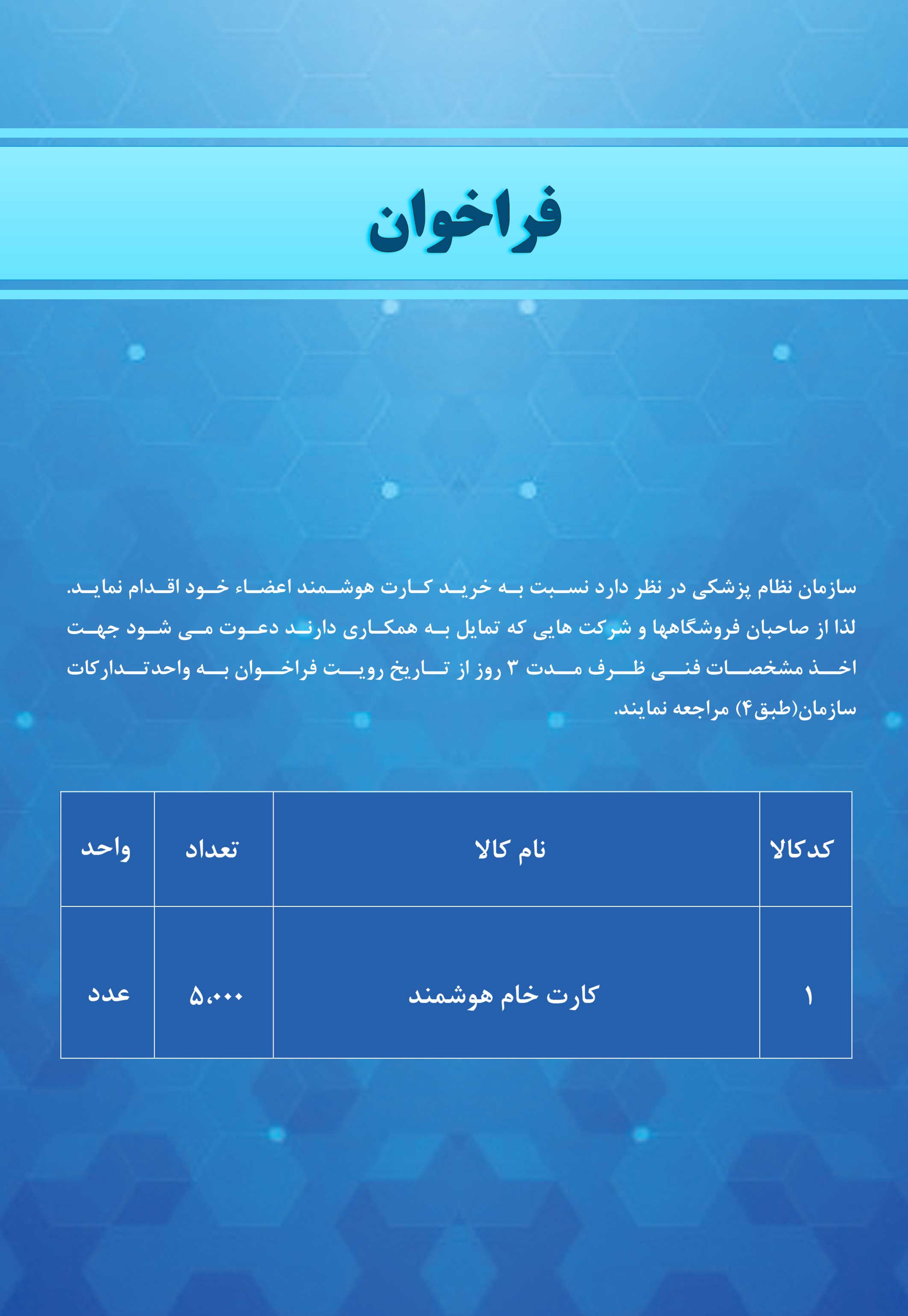 فراخوان تامین 5000 عدد کارت هوشمند اعضا سازمان نظام پزشکی