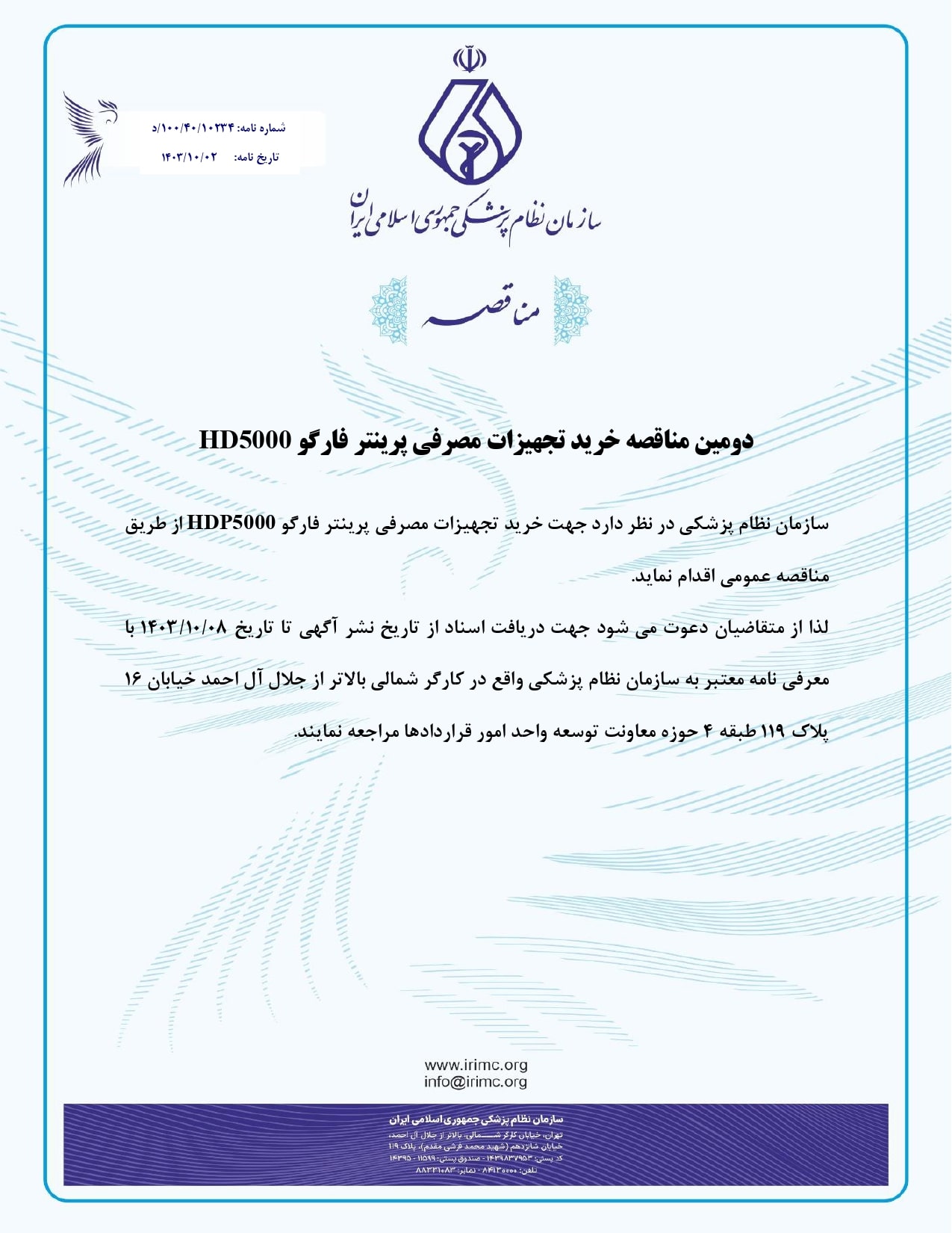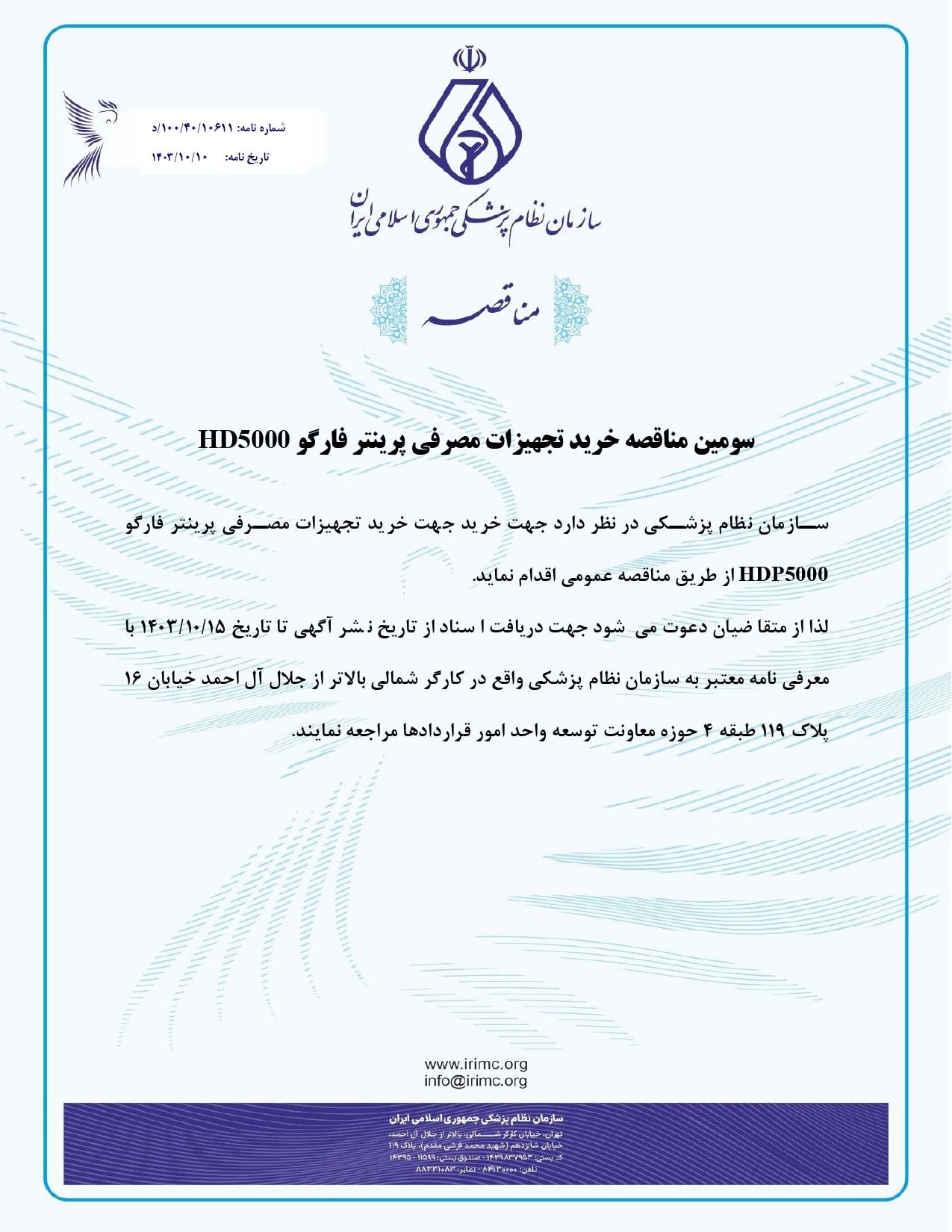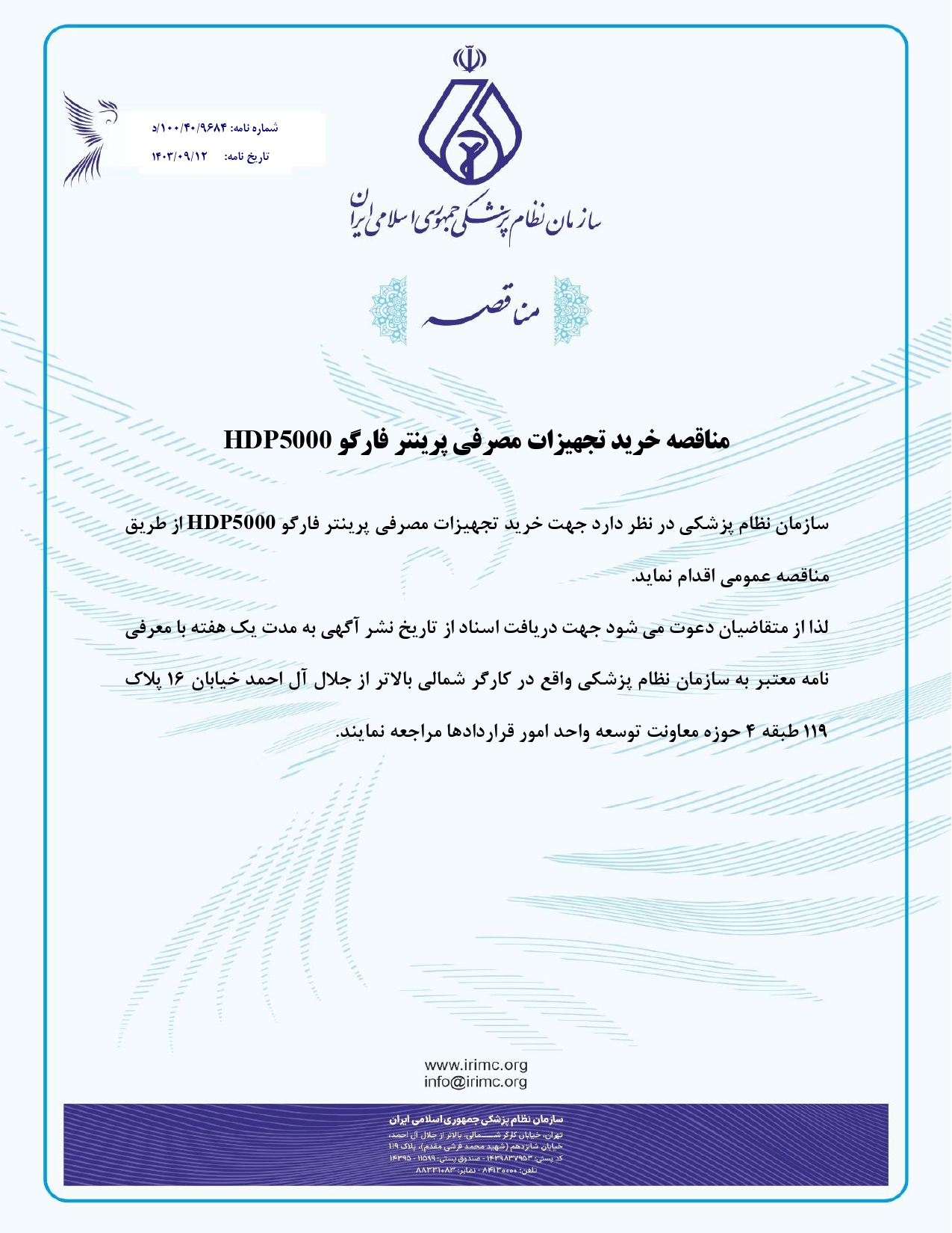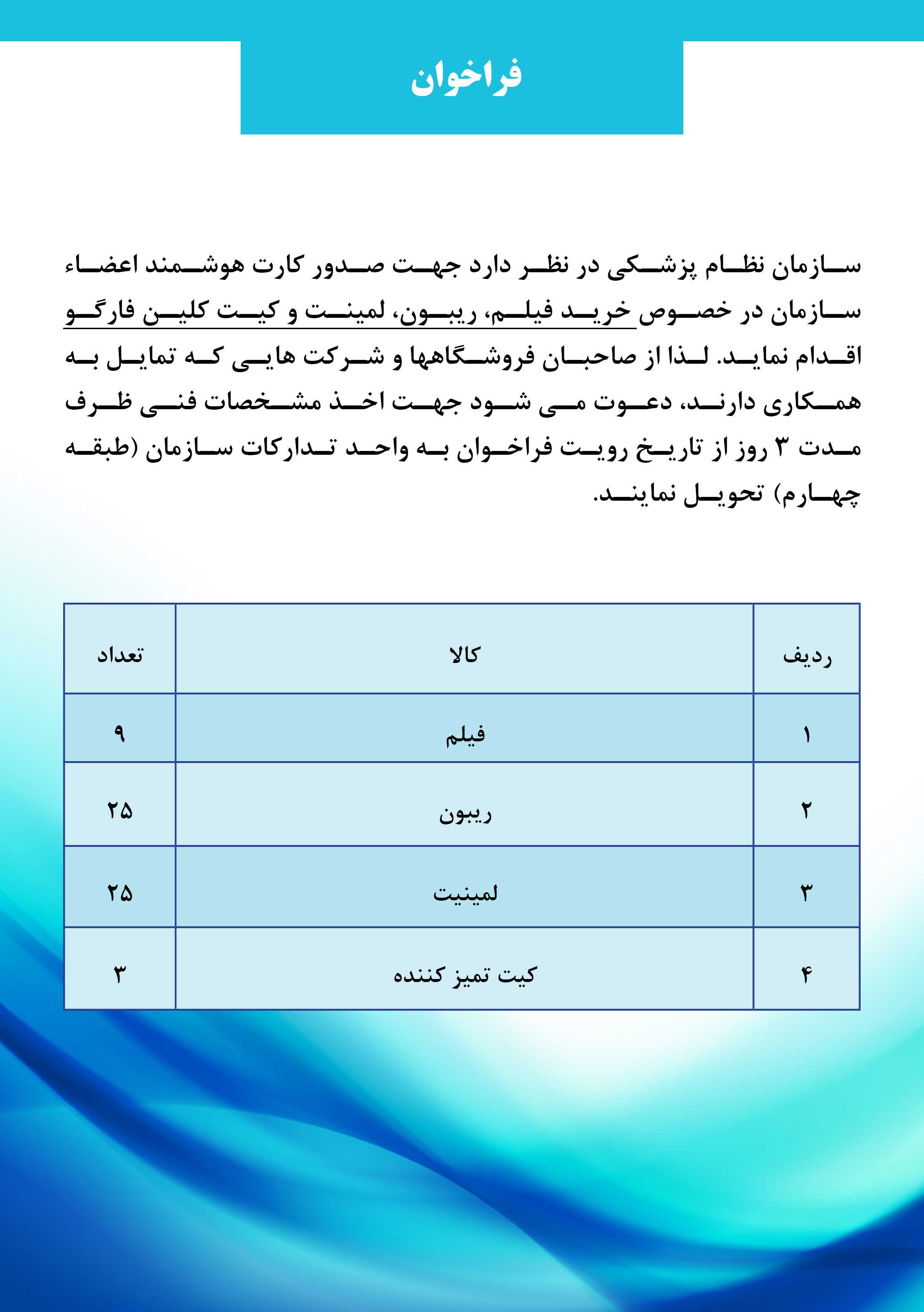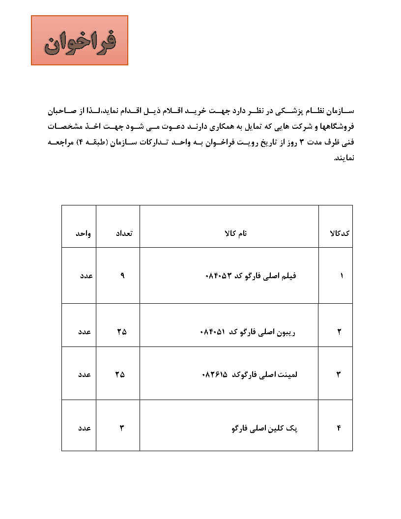 فراخوان واحد تدارکات سازمان نظام پزشکی در خصوص خرید فیلم، ریبون، لمینت و کیت کلین فارگو