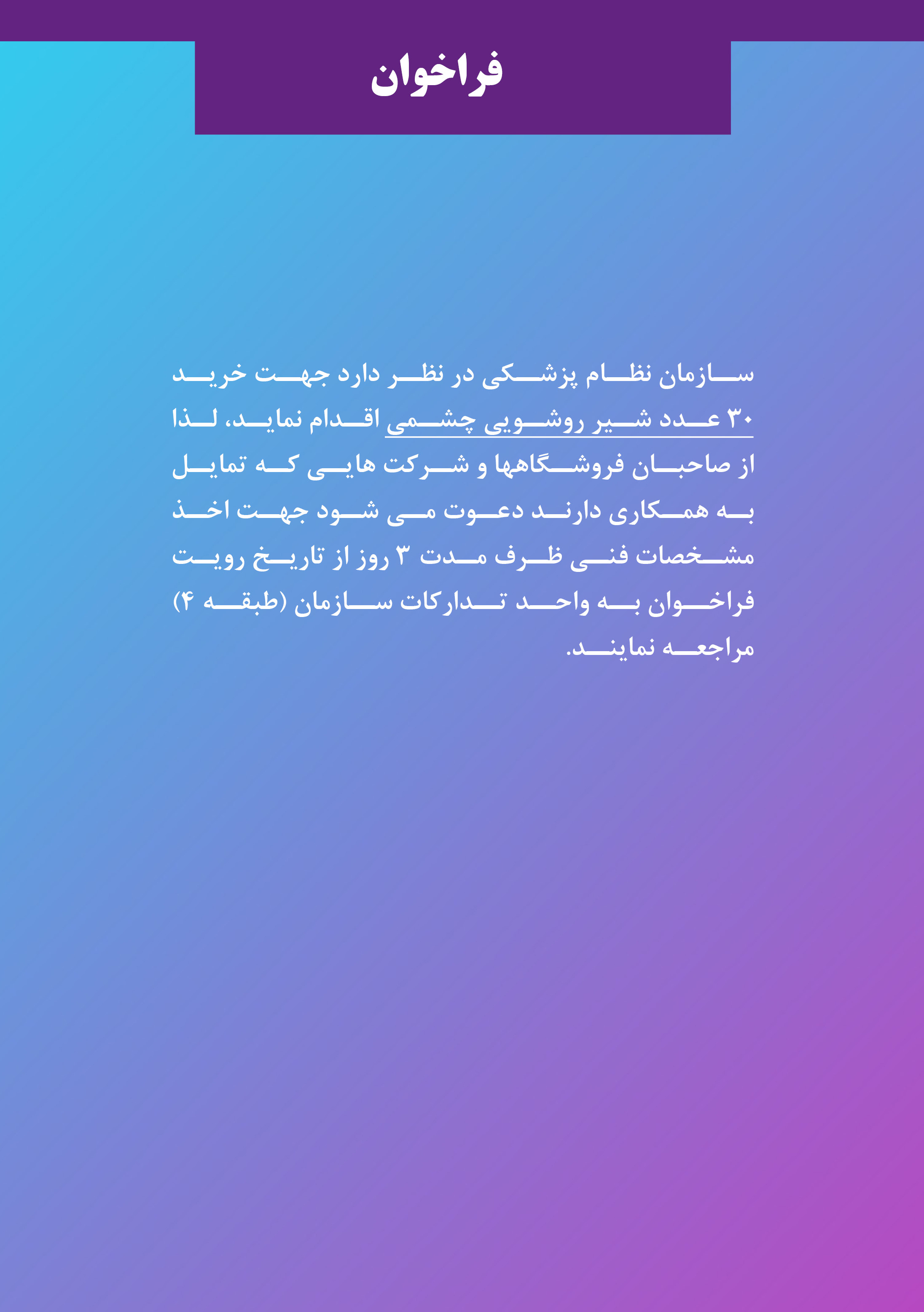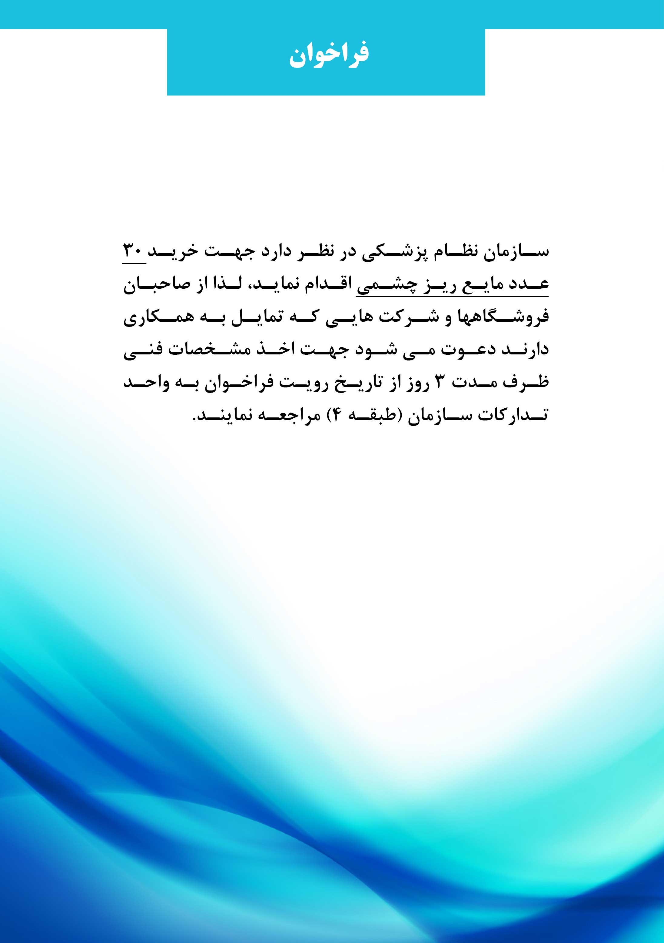 فراخوان واحد تدارکات سازمان نظام پزشکی در خصوص خرید 30 عدد مایع ریز چشمی