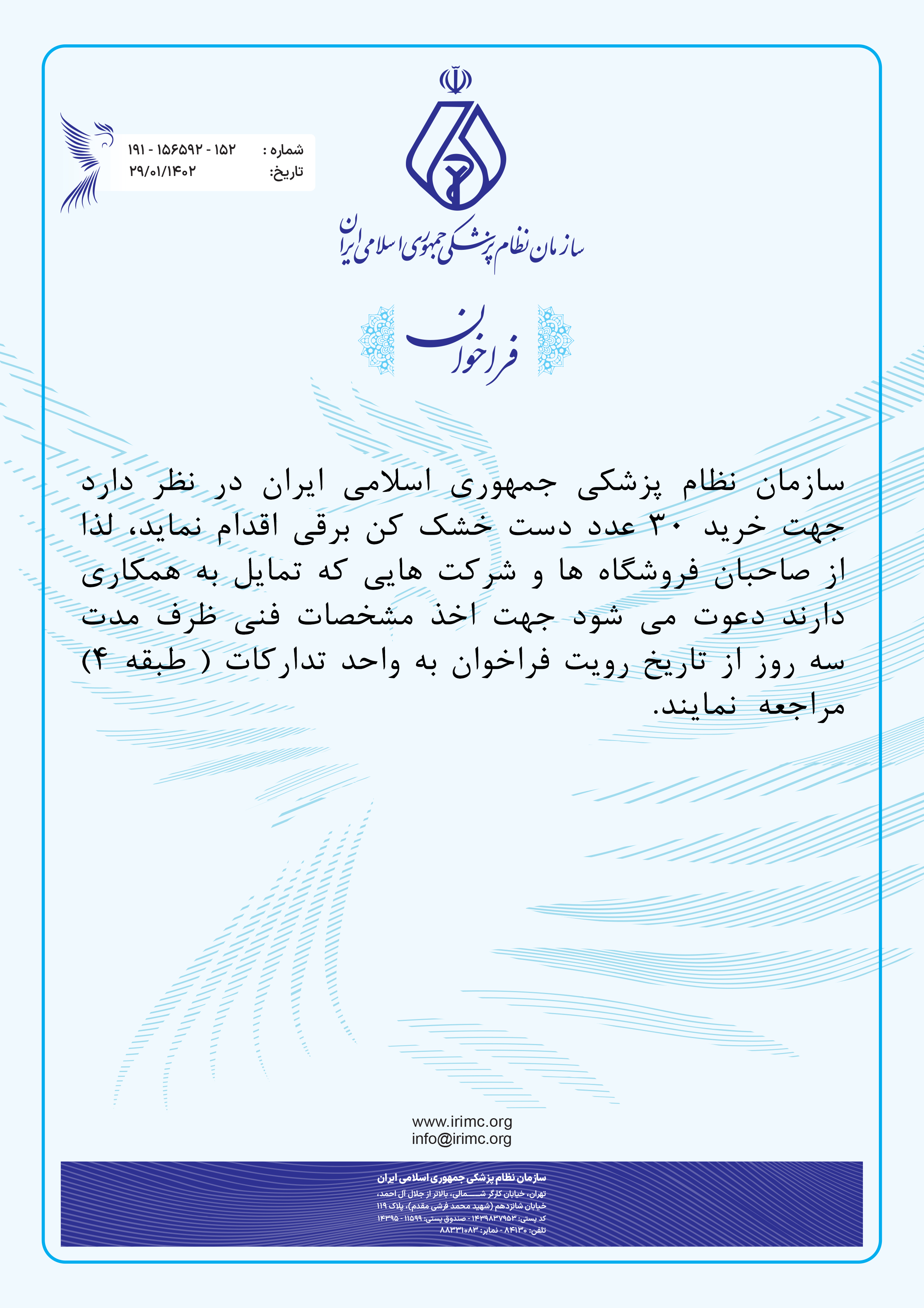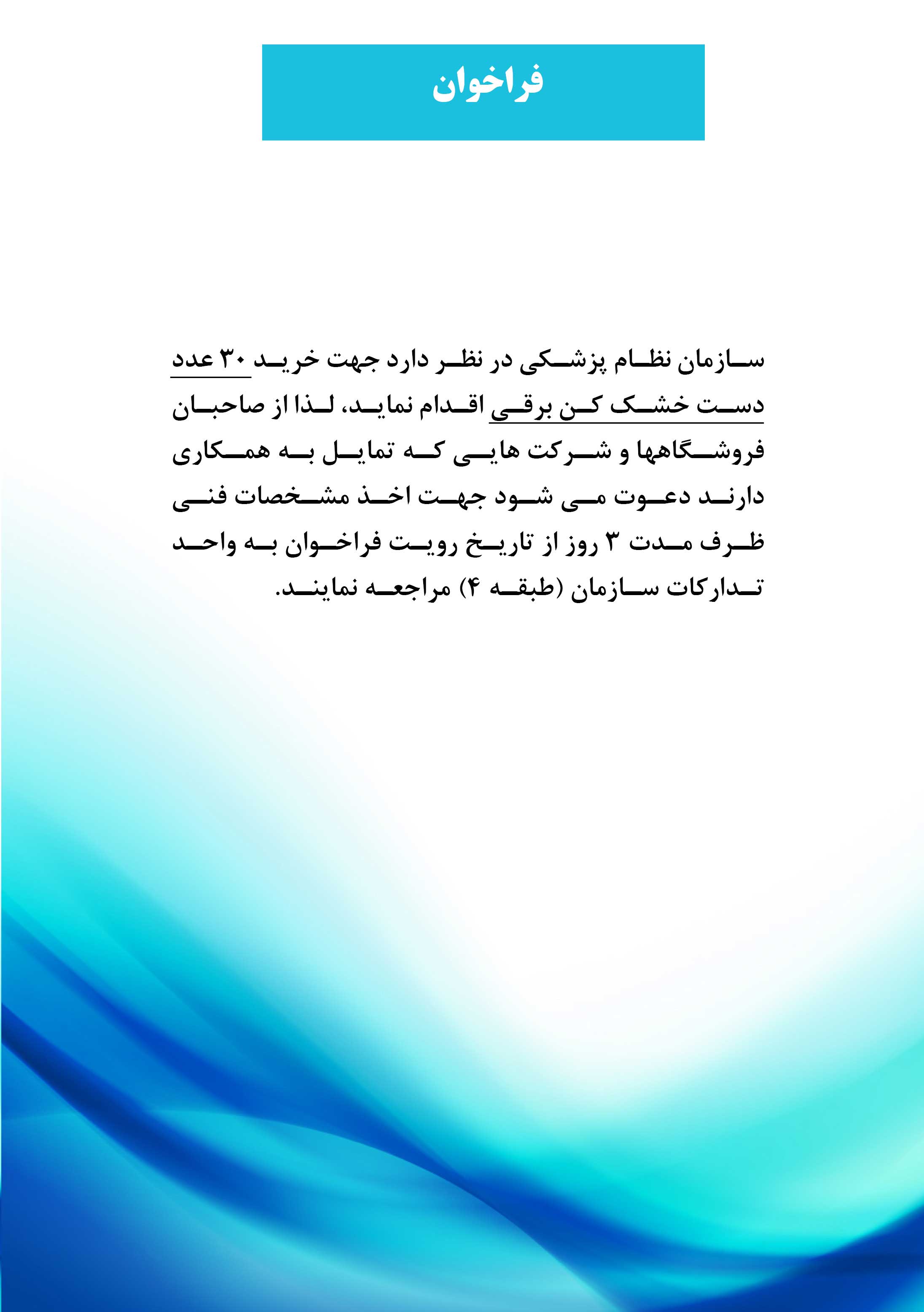فراخوان واحد تدارکات سازمان نظام پزشکی در خصوص خرید 30 عدد دست خشک کن برقی