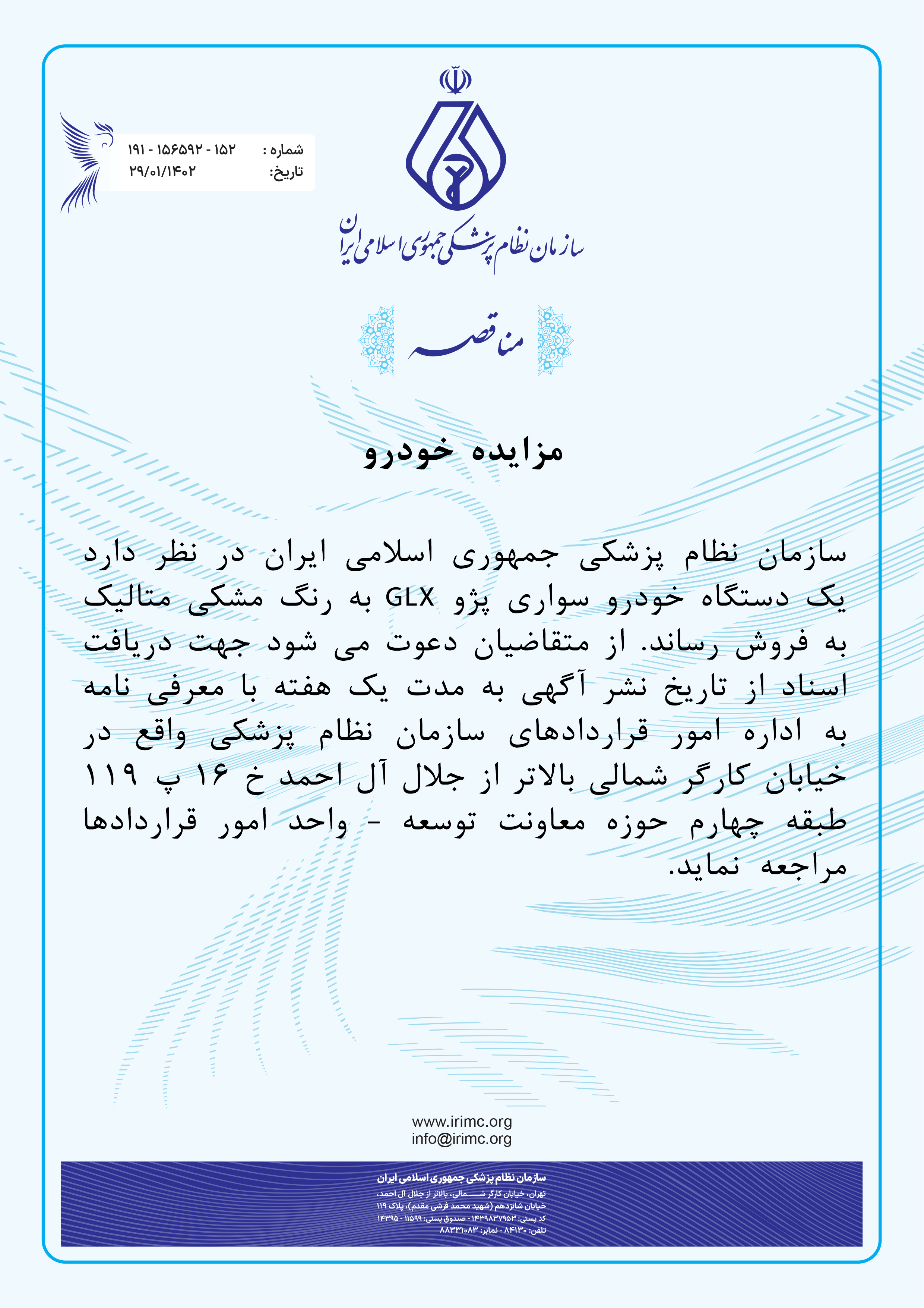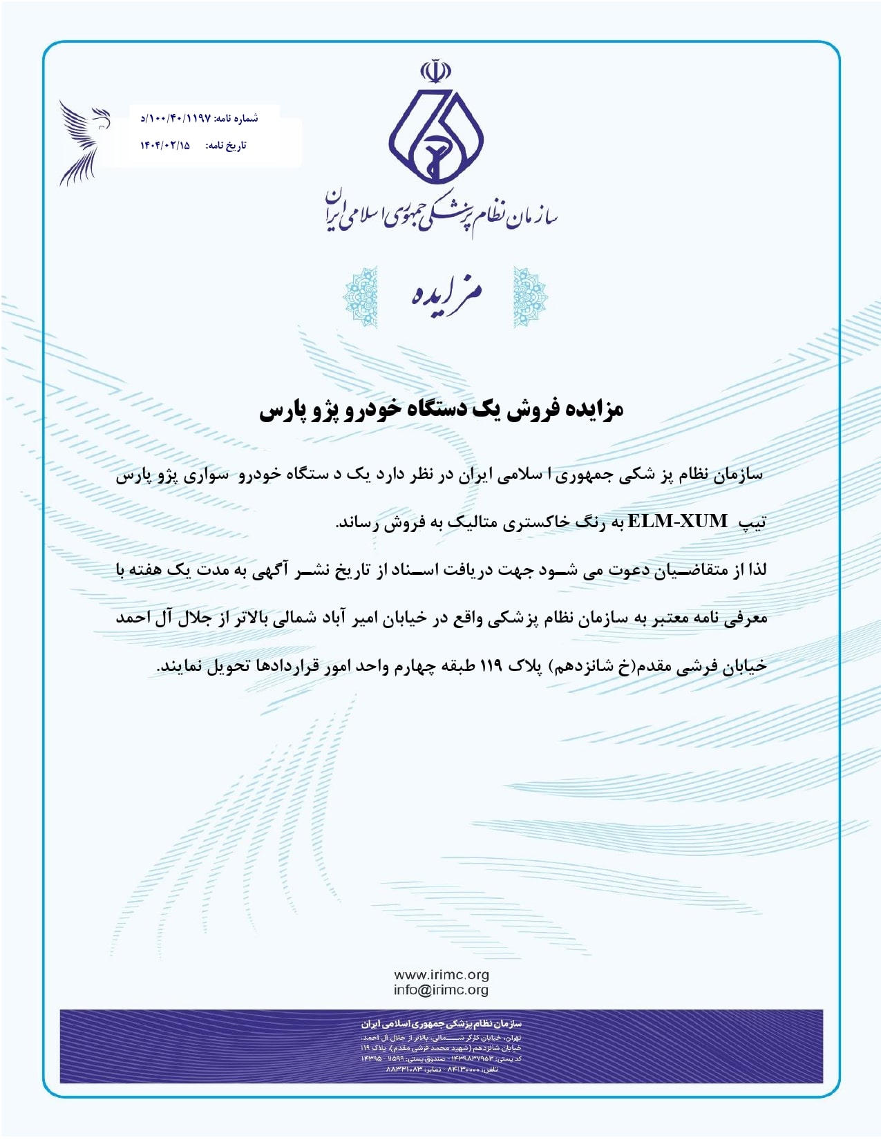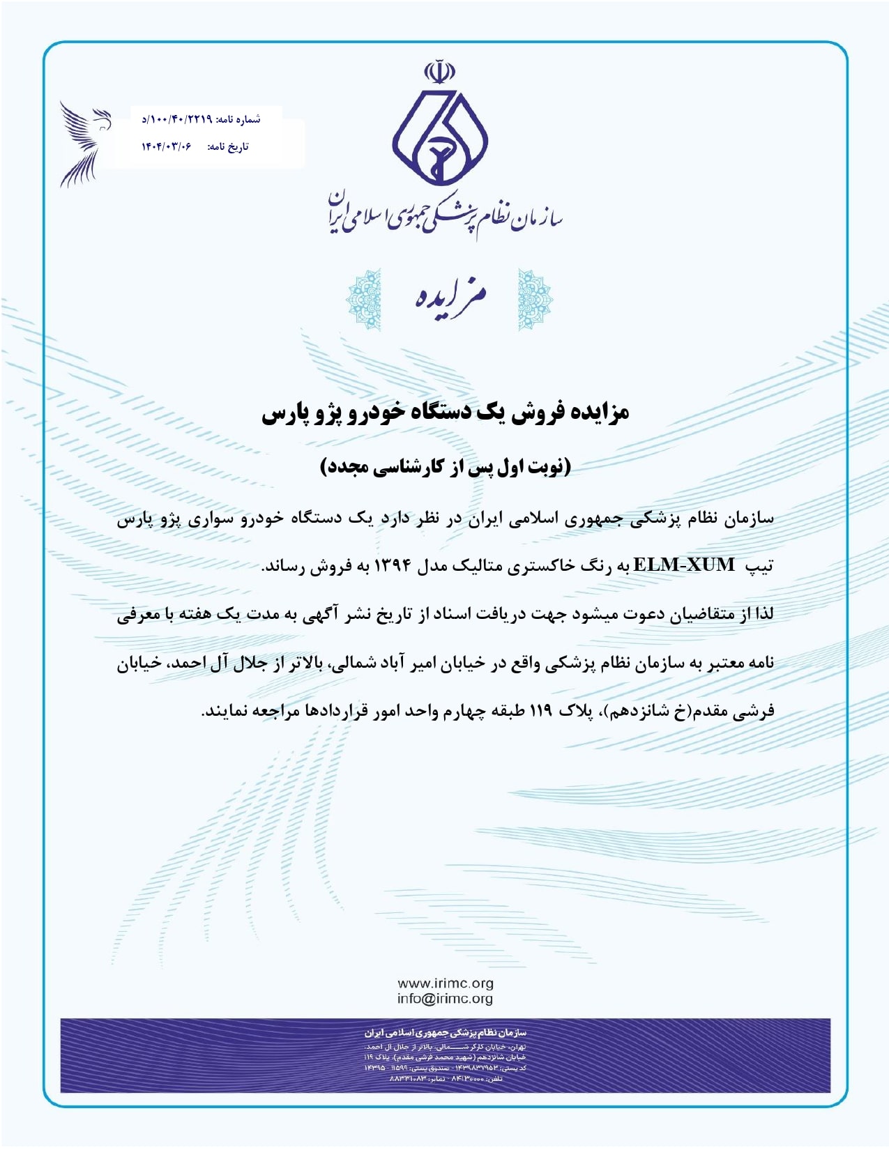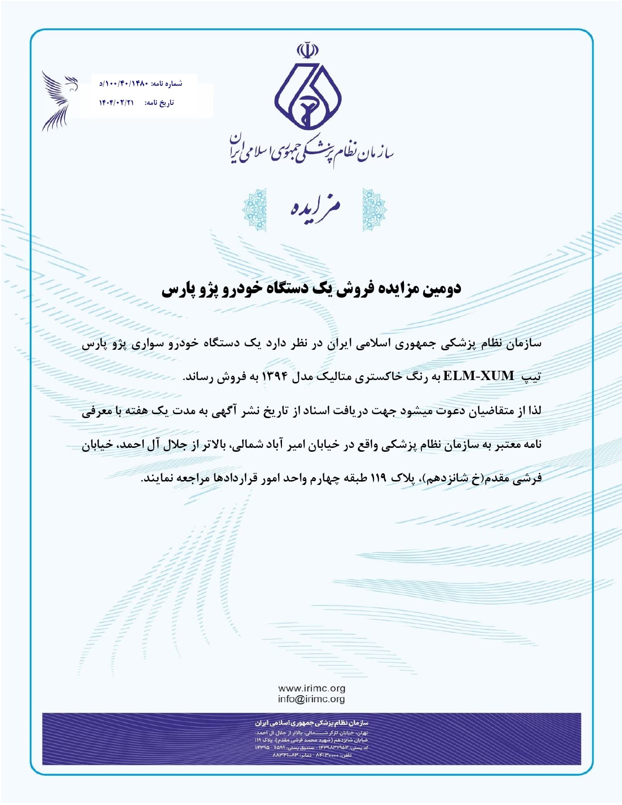 سومین مزایده فروش یک دستگاه خودرو پژو پارس