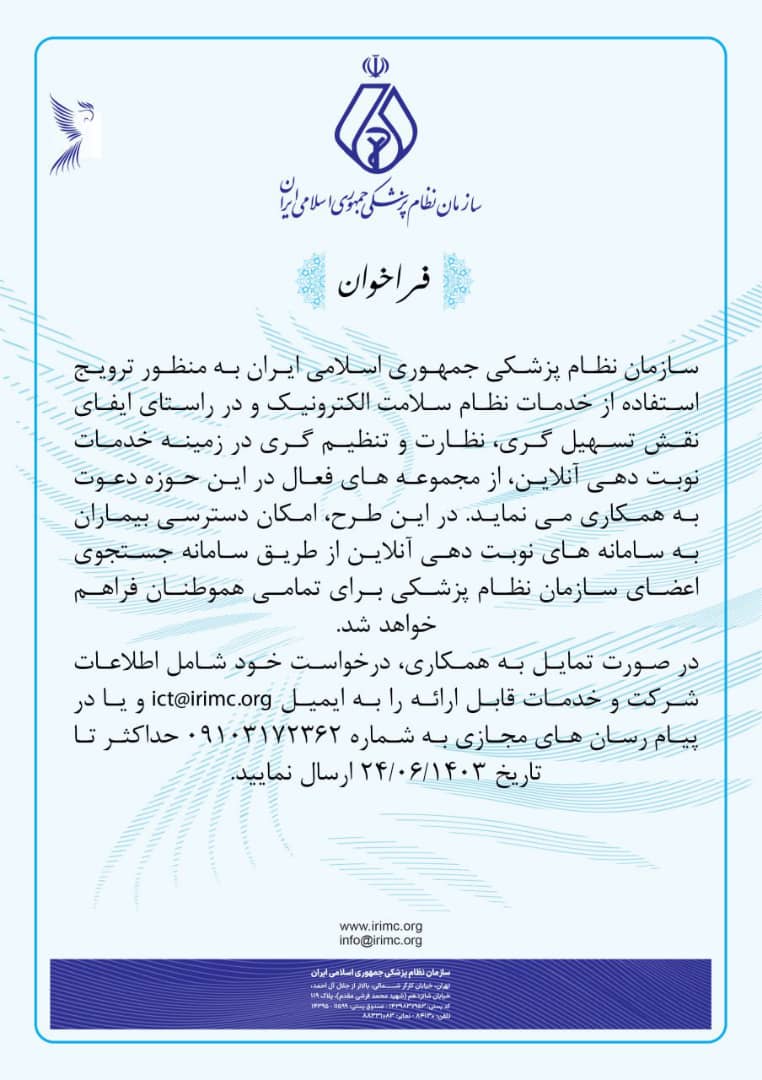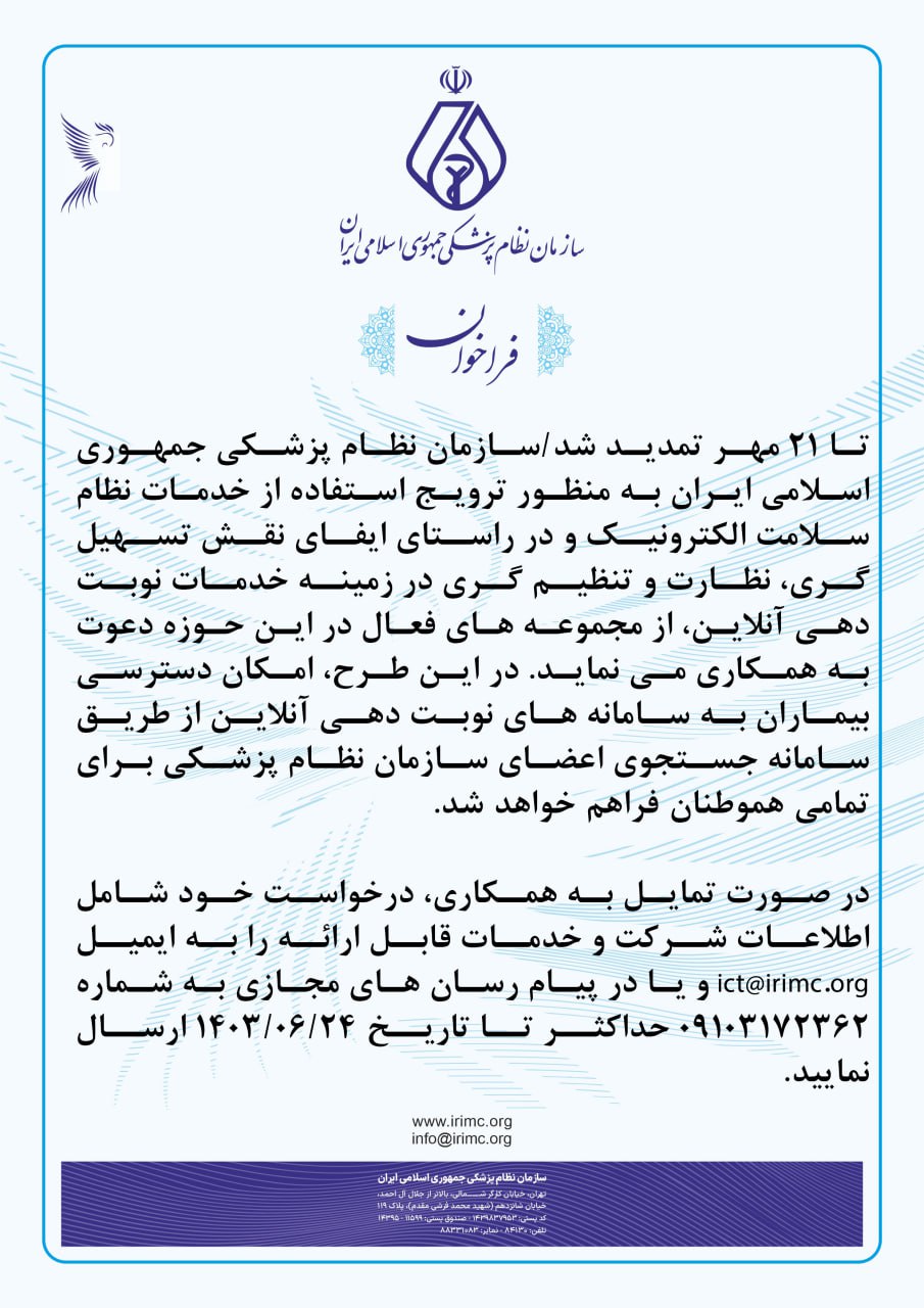 تا تاریخ 1403/07/06 تمدید شد/دعوت به همکاری به منظور ترویج استفاده از خدمات نظام سلامت الکترونیک در زمینه خدمات نوبت دهی آنلاین