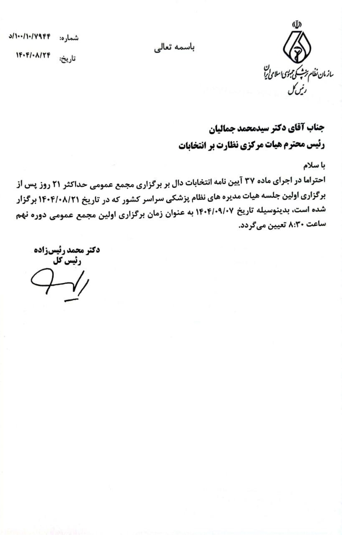 زمان برگزاری مجمع عمومی، طبق اطلاع و توافق قبلی با هیأت نظارت، همان ۷ آذرماه خواهد بود.