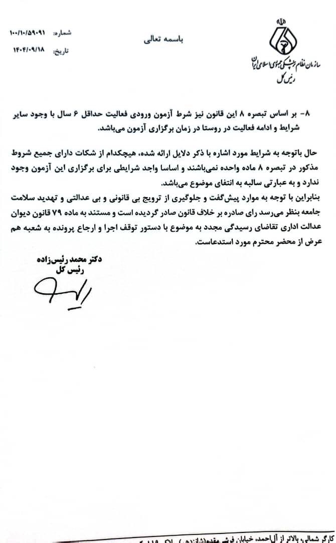رییس کل سازمان نظام پزشکی در نامه‌ای رسمی به رئیس دیوان عدالت اداری خواستار توقف اجرای دادنامه‌های مرتبط با آزمون دندانپزشکی تبصره ۸ شد.