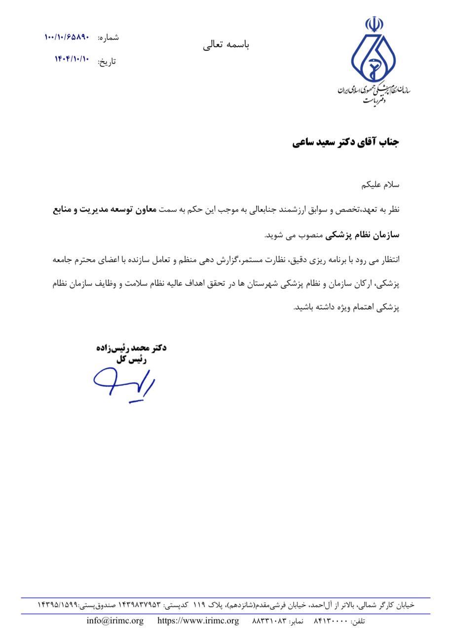 با حکم دکتر محمد رئیس‌زاده، دکتر سعید ساعی به عنوان «معاون توسعه، مدیریت و منابع سازمان نظام پزشکی» منصوب شد.