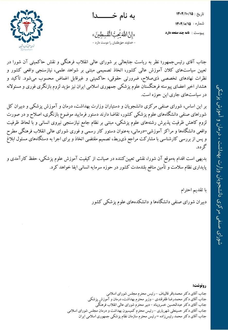 در این نامه، بر ضرورت نیازسنجی واقعی و مبتنی بر ظرفیت‌های موجود نظام سلامت تأکید شده و نسبت به تصمیمات شتاب‌زده در افزایش ظرفیت، بدون توسعه زیرساخت‌های آموزشی، درمانی و رفاهی هشدار داده شده است.