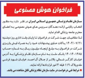 سازمان نظام پزشکی جمهوری اسلامی ایران در نظر دارد به منظور انتخاب رقابتی ارائه دهندگان سرویس های هوش مصنوعی به اعضای محترم جامعه پزشکی فراخوانی را منتشر نماید: