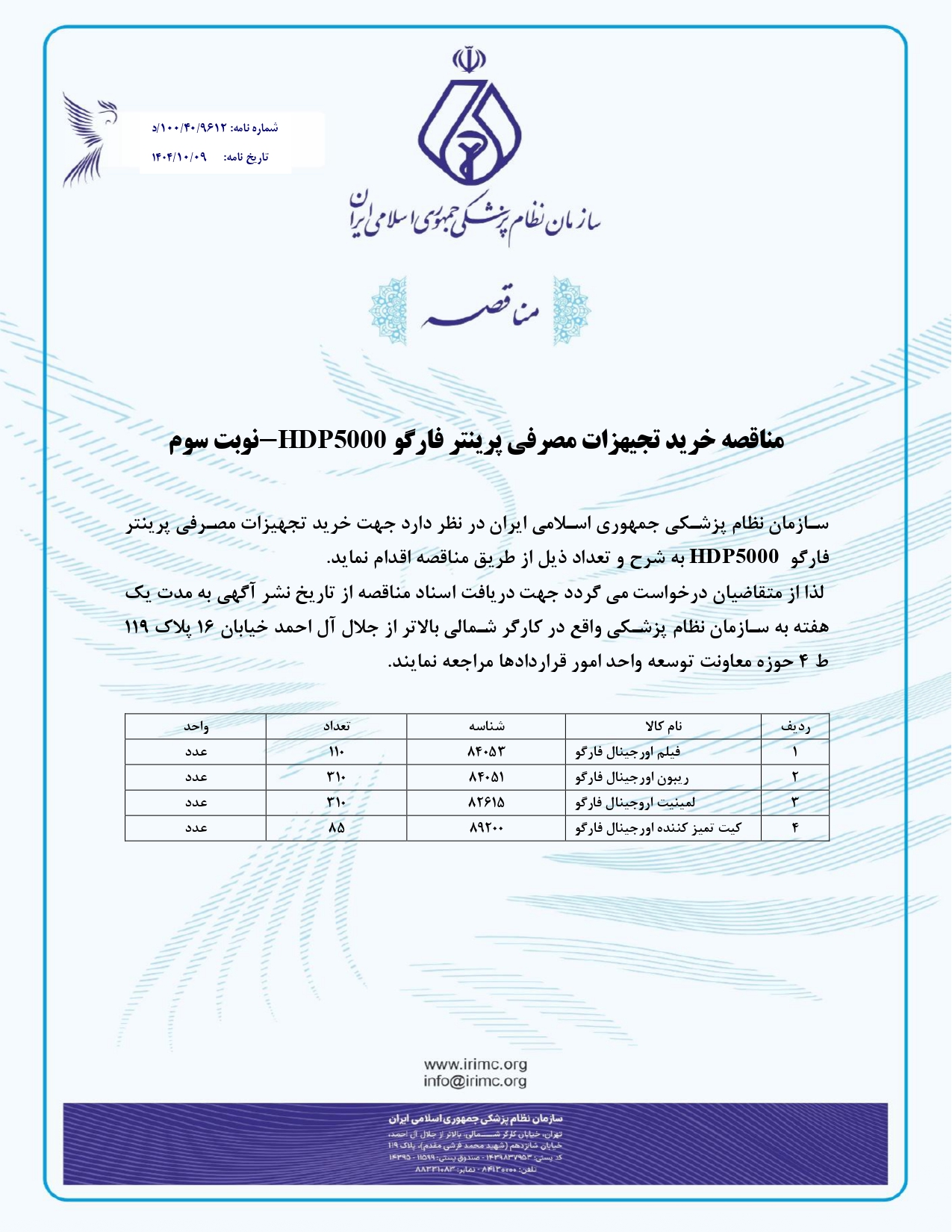 مناقصه خرید تجهیزات مصرفی پرینتر فارگو HDP5000