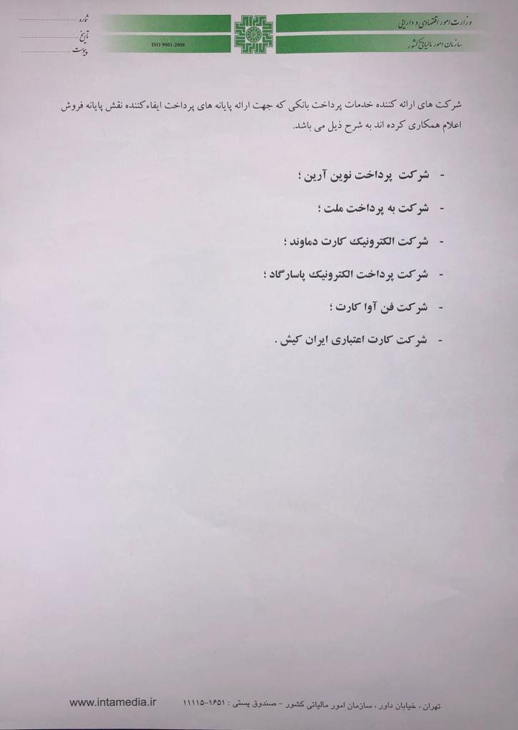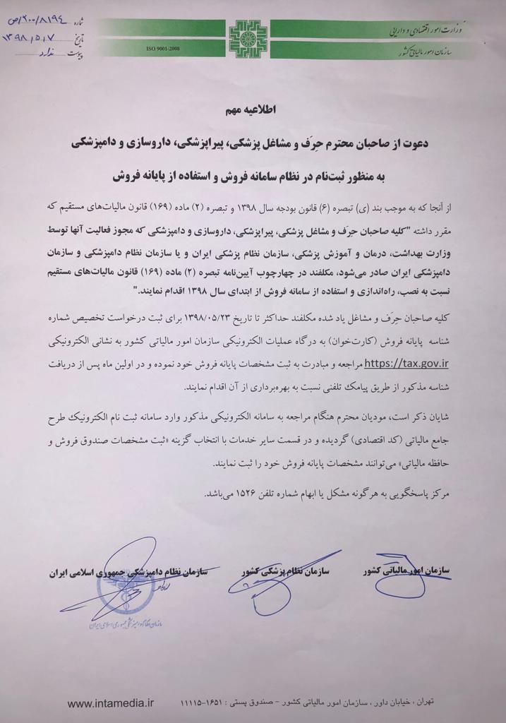 کلیه صاحبان حرف و مشاغل پزشکی، پیراپزشکی ، داروسازی و دامپزشکی که مجوز فعالیت آنها توسط وزارت بهداشت ، سازمان نظام پزشکی ایران و سازمان دامپزشکی ایران صادر می شود ، مکلفند در چهارچوب آیین نامه تبصره (2) ماده (169) قانون مالیات های مستقیم نسبت به نصب، راه اندازی و استفاده از سامانه فروش (کارتخوان) از ابتدای سال 1398 اقدام نمایند.