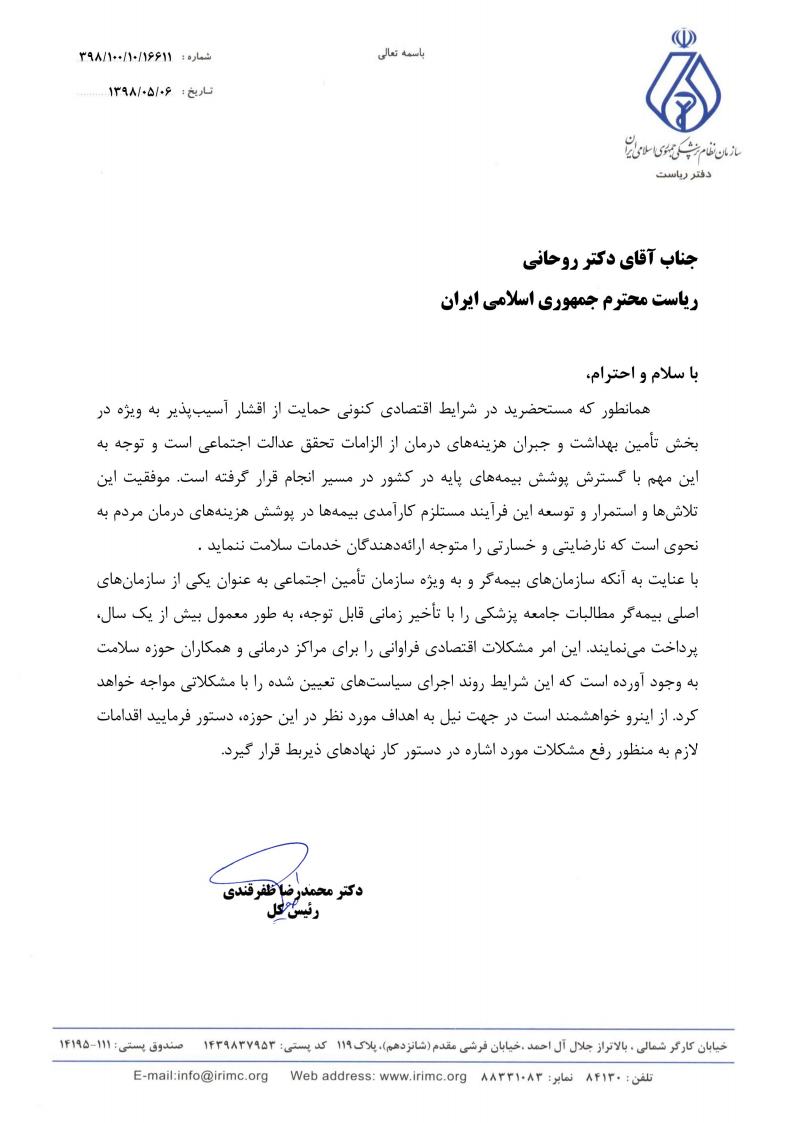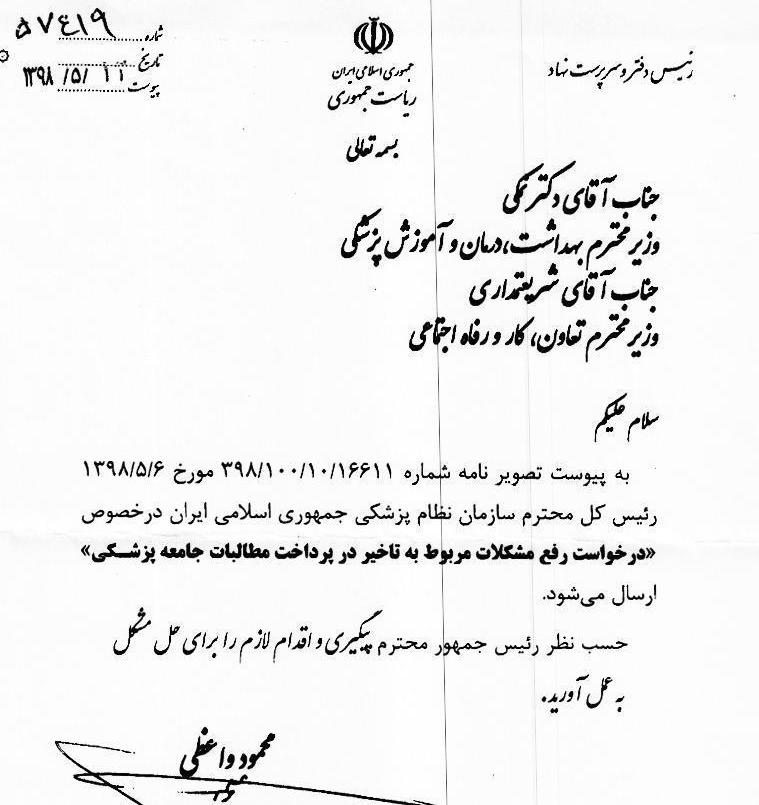به گزارش اداره کل روابط عمومی سازمان نظام پزشکی متن نامه رئیس دفتر و سرپرست نهاد ریاست جمهوری در ذیل آمده است: