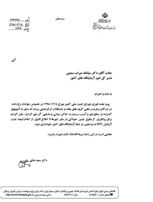 تصویر نامه منتسب به وزیر بهداشت خطاب به مدیر کل امور آزمایشگاههای کشور در ذیل آمده است: