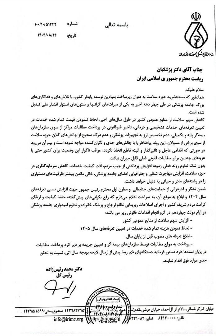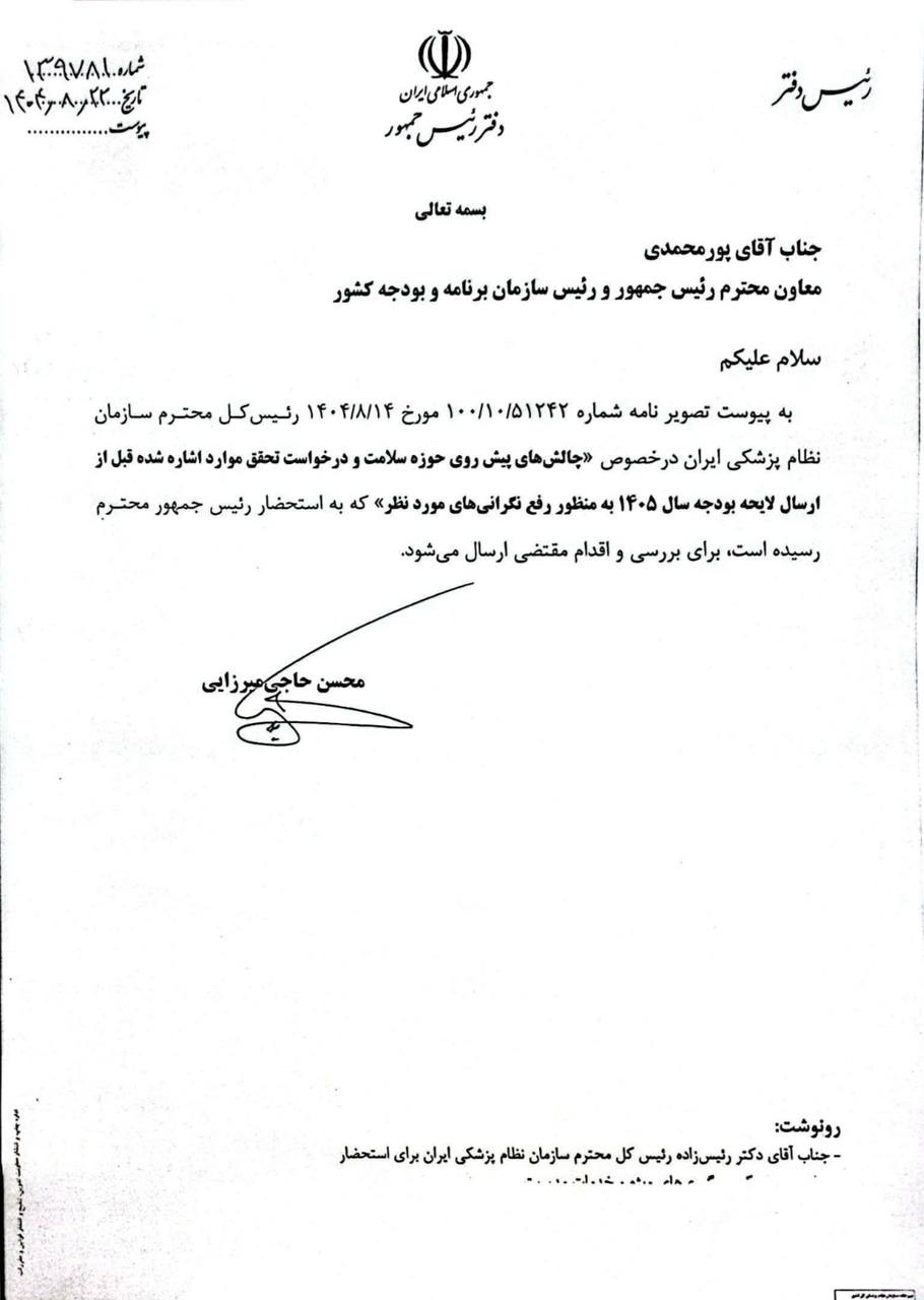 دفتر رئیس‌جمهور با ارسال نامه‌ای به سازمان برنامه و بودجه، خواستار بررسی فوری درخواست‌های سازمان نظام پزشکی درباره «چالش‌های پیش‌روی حوزه سلامت» و رفع نگرانی‌های مطرح‌شده پیش از نهایی شدن لایحه بودجه ۱۴۰۵ شد.